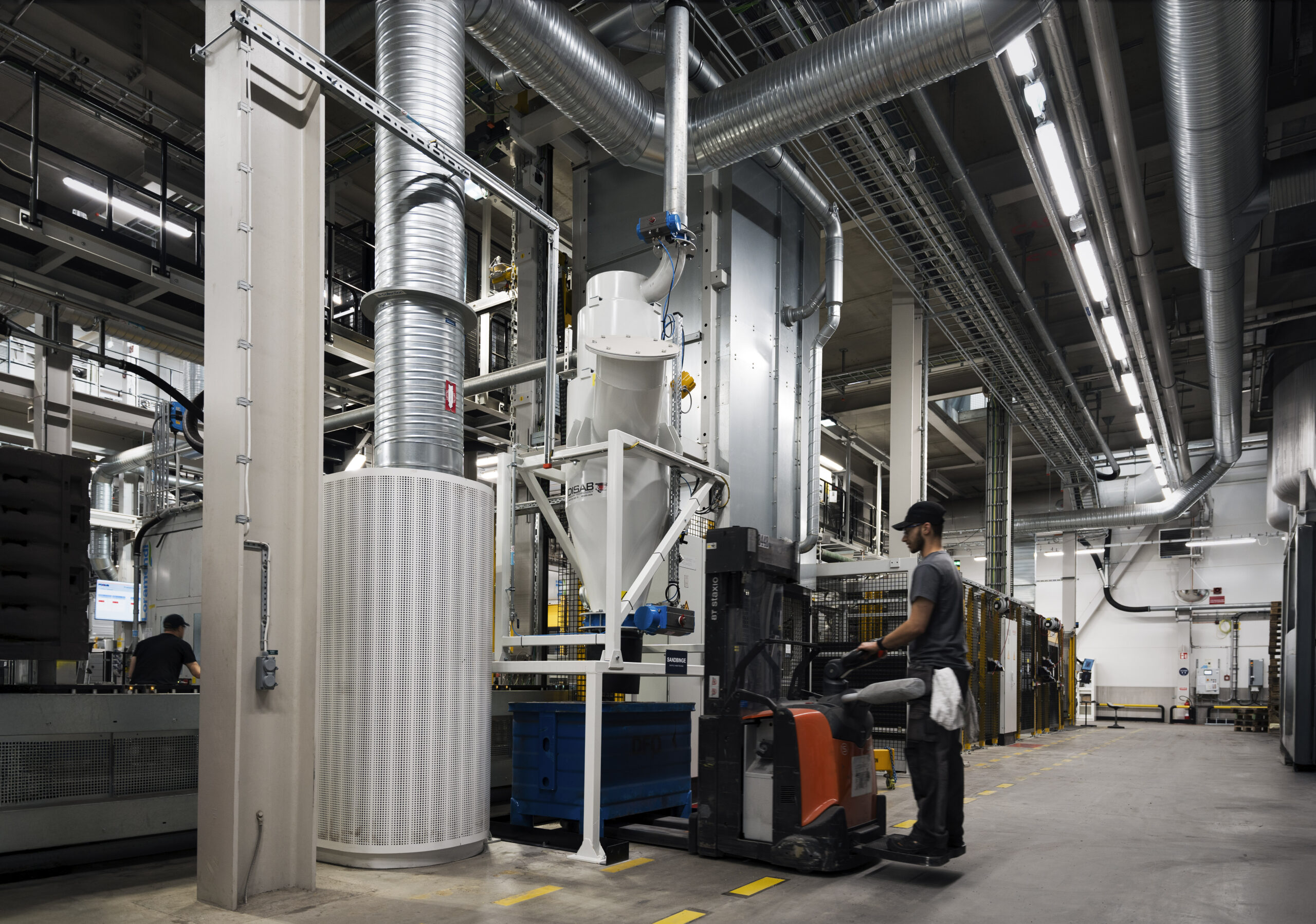 In 2024, DISAB installed two state-of-the-art vacuum systems at Scania’s Södertälje facility. These systems were customized to meet the specific demands of Scania’s advanced foundry, where the scale of sand use and recycling is immense. The systems include the DISAB PES-7 and DISAB PES-301 electric vacuum units, supplemented with mobile filter separators (BEAL), ensuring a robust and reliable cleaning process.